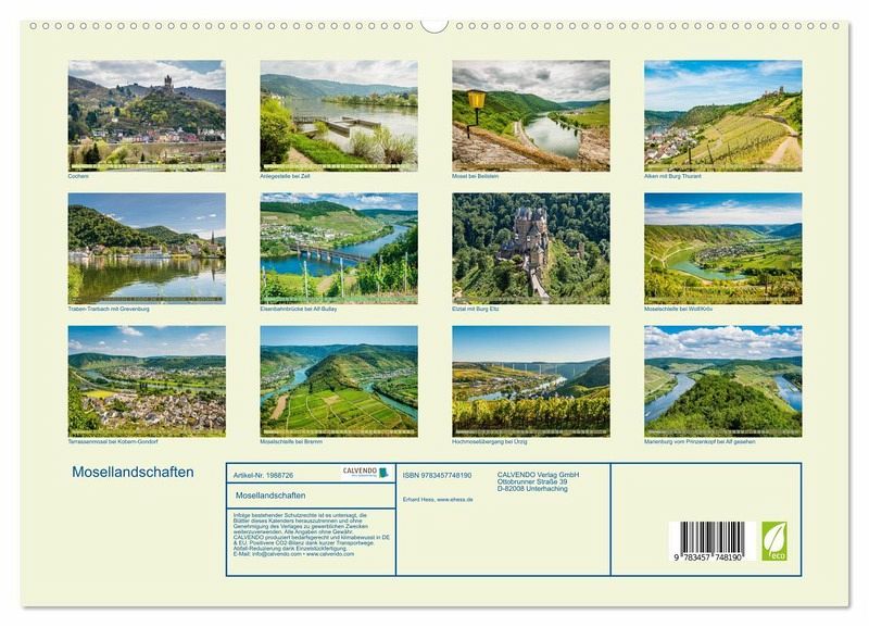 Die Mosel - nach dem Rhein die zweitwichtigste Schifffahrtsstraße Deutschlands - zählt zu den am meisten befahrenen Wasserstraßen in Europa.Besonders interessant sind die Abschnitte von Trier bis Pünderich, als Mittelmosel bekannt, und der zwischen Pünderich und der Mündung in Koblenz, der Untermosel oder auch Terrassenmosel genannt wird.Durch die traumhafte Landschaft für Touristen interessant, begann man schon früh mit der Erschließung durch Verkehrswege. So verlaufen im Moseltal die Moselweinstraße und der Mosel-Radweg, der von Metz in Frankreich über Trier bis nach Koblenz führt. Ebenso gibt es seit 1910 den Moselhöhenweg, ein Wanderweg, der auf der Eifelseite 185 km und auf der Hunsrückseite 262 km lang ist.Schließlich wurde 2014 der Moselsteig eröffnet, der mit insgesamt 365 Kilometern Wanderwegen, ebenso wie die sogenannten Seitensprünge und Traumpfade diese herrliche Gegend zu Fuß erkunden lässt.Der vorliegende Kalender versucht, mit professionellen Fotos einen kleinen Einblick in diese Landschaften zu geben.
