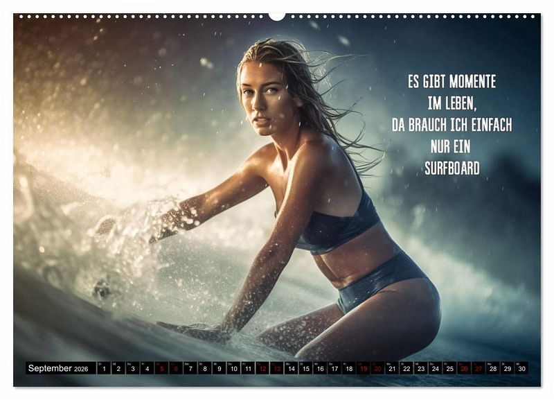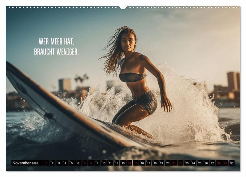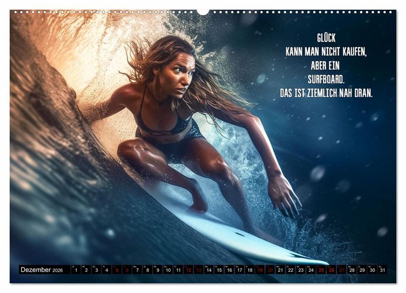 In diesem einmaligen Kalender erwarten Sie nicht nur wunderschöne Frauen mit ihren Surfboards, sondern auch coole Sprüche. Lassen Sie sich begeistern. Die wunderbaren Bilder und positiven Sprüche werden Ihnen helfen, sollte es Ihnen mal nicht so gut gehen. Dann werden diese Sie aufmuntern und eine unheimliche Energie und Lebensfreude in Ihnen freisetzen. Er eignet sich auch hervorragend als Geschenk für Ihre Bekannten und Verwandten, sie werden sich ganz bestimmt darüber freuen. Erstellt wurden die Bilder im Übrigen mit einer KI und Photoshop.