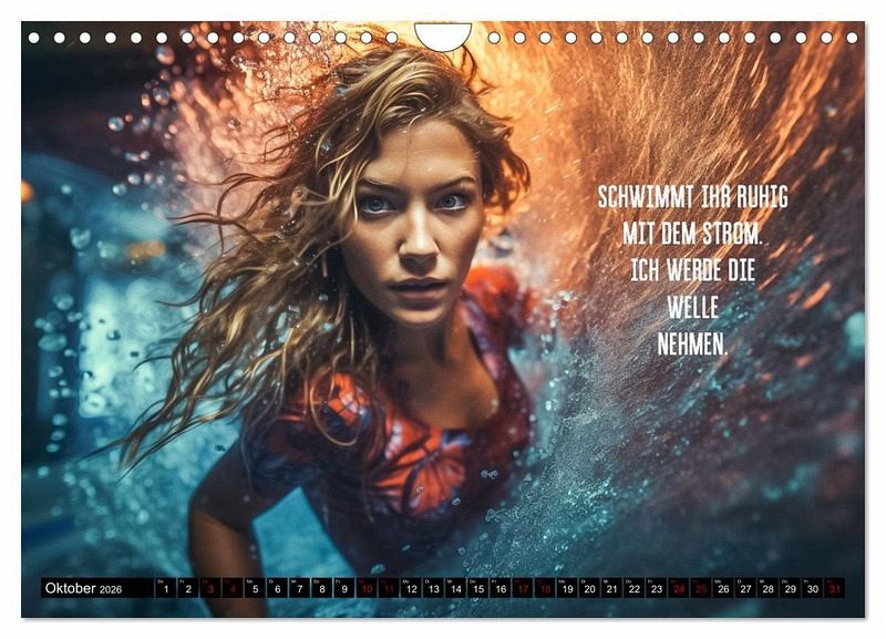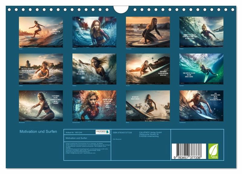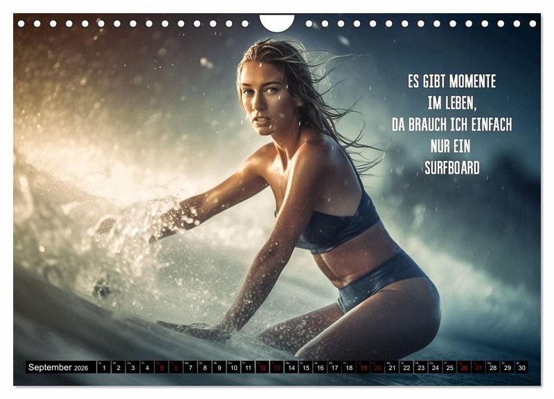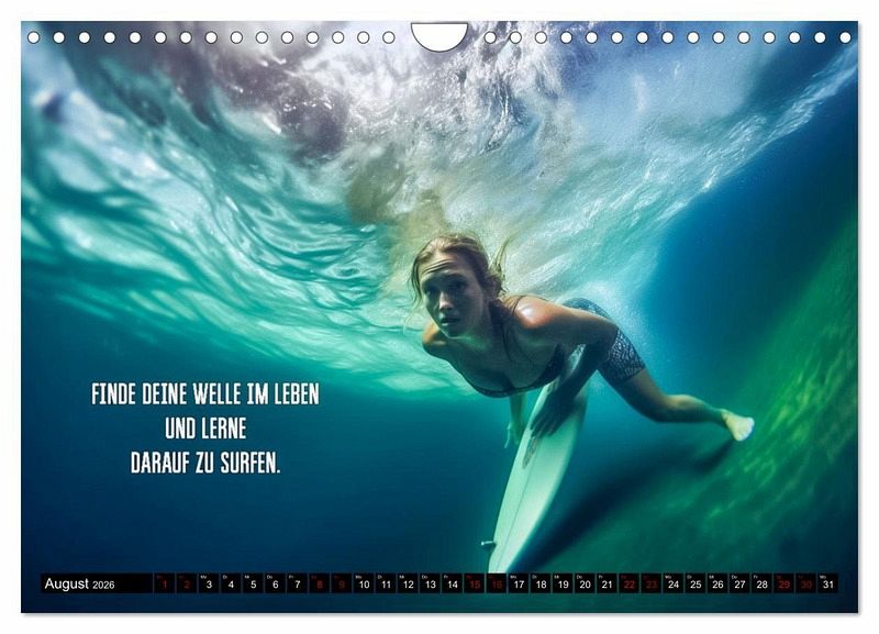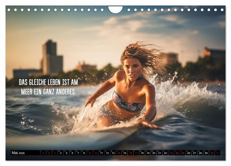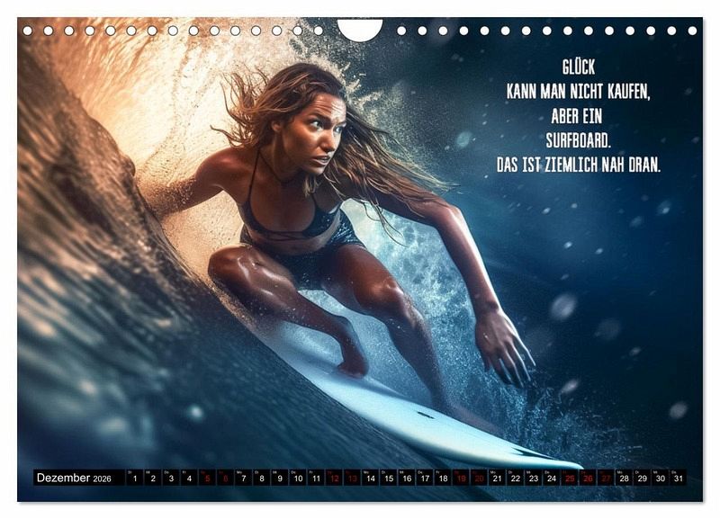 In diesem einmaligen Kalender erwarten Sie nicht nur wunderschöne Frauen mit ihren Surfboards, sondern auch coole Sprüche. Lassen Sie sich begeistern. Die wunderbaren Bilder und positiven Sprüche werden Ihnen helfen, sollte es Ihnen mal nicht so gut gehen. Dann werden diese Sie aufmuntern und eine unheimliche Energie und Lebensfreude in Ihnen freisetzen. Er eignet sich auch hervorragend als Geschenk für Ihre Bekannten und Verwandten, sie werden sich ganz bestimmt darüber freuen. Erstellt wurden die Bilder im Übrigen mit einer KI und Photoshop.