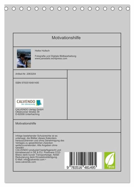 QUALITÄT - Hochwertiger Fotokalender mit 12 wunderschönen Motiven auf lichtbeständigem Bilderdruckpapier, robuste Spiralbindung.NACHHALTIG - deutliche Abfallreduzierung durch bedarfsgerechte Einzelstückfertigung, umweltfreundliches FSC-zertifiziertes Papier, Produktion in Deutschland, klimabewusste Logistik.PERFEKTES GESCHENK - Kalender für Freunde und Familie, für Kinder und Erwachsene, jung und alt, zu Weihnachten, Geburtstag oder zwischendurch.VIELFALT - Bildkalender in verschiedenen Formaten, z.B. DIN A5, DIN A4, DIN A3 sowie DIN A2. Ob Naturmotiv, Gemälde oder Fotos, ideal für ein persönliches Wohlfühlambiente.Ein Planer der besonderen Art von Autor(in): Heike Hultsch