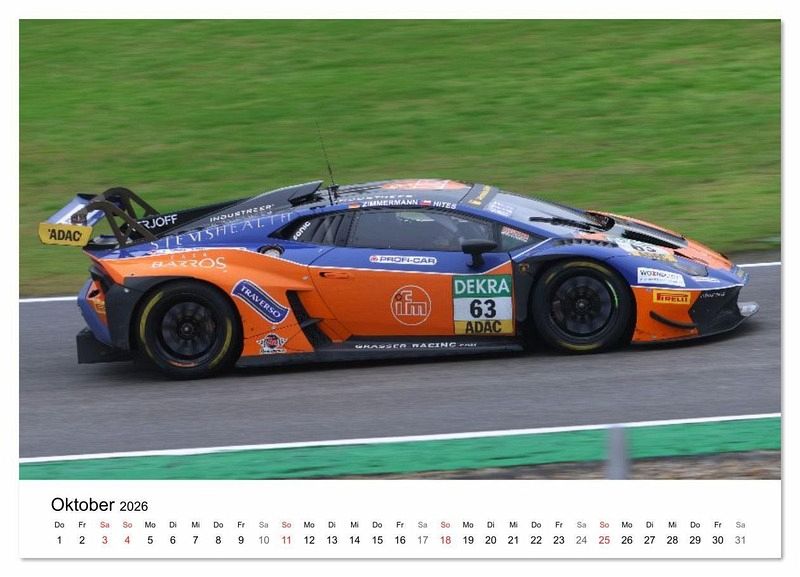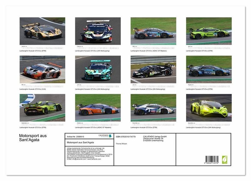 Kalender mit Bildern diverser Lamborghini Huracan Rennfahrzeuge. Die Fotos für diesen Kalender stammen vom 24h Rennen auf dem Nürburgring, der VLN, der DTM und aus dem ADAC GT Masters.