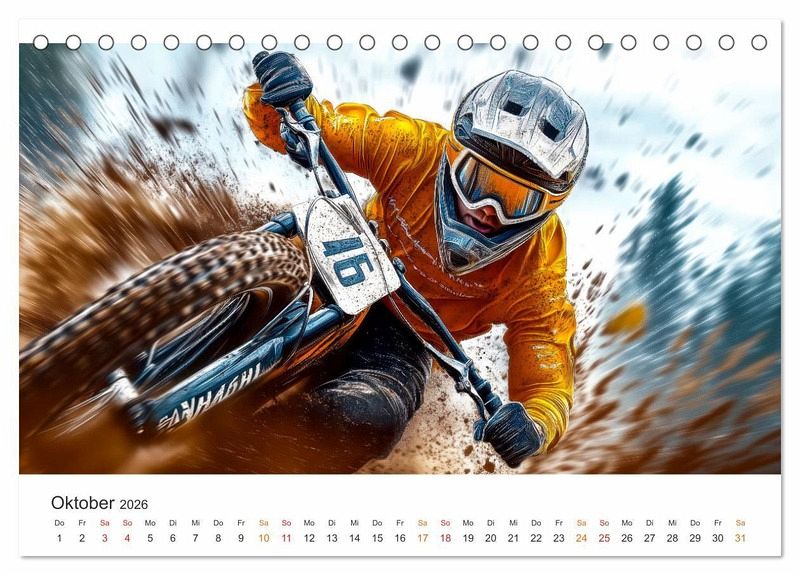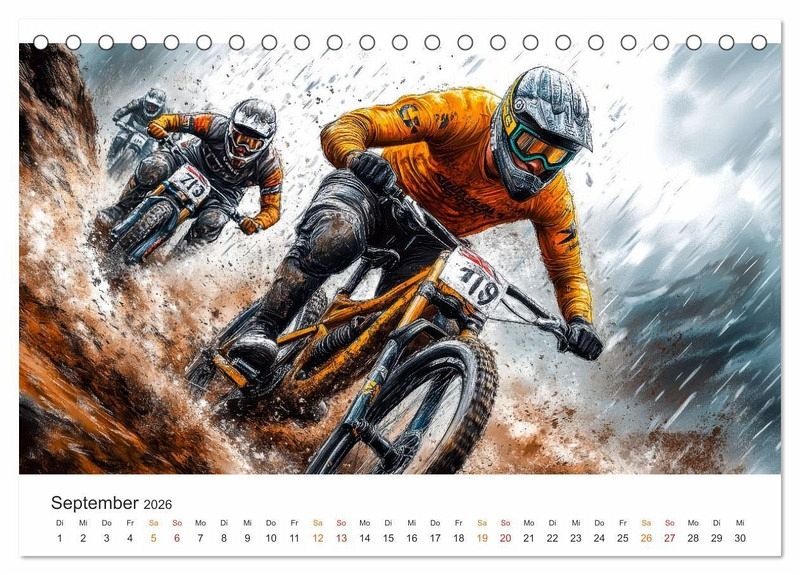 Spüren Sie den Herzschlag des Abenteuers, Monat für Monat. Fangen Sie die atemberaubenden Momente ein, in denen Leidenschaft auf Naturgewalt trifft. Waghalsige Trails, tosendes Gelände, tiefe Schluchten und felsige Bergpfade oder die Schönheit abgelegener Pfade und Landschaften aus einzigartigen Perspektiven - diese KI-Bilder erzählen Geschichten von Mut, Geschwindigkeit und unbändiger Freiheit. Ein perfekter Kalender für alle Sportfans und die, die Mountainbiking nicht nur als Sport, sondern als Lebensgefühl verstehen.