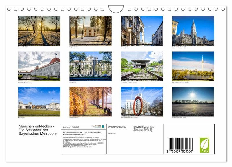 Der Kalender zeigt jeden Monat ein anderes Motiv von Bayerns wunderschöner Hauptstadt. Alte Bauwerke, moderne Architektur, Freizeit- und Erholungsorte. Lassen Sie sich verzaubern von der Vielfalt Münchens.