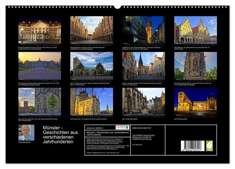 PREMIUM-LINIE - Brillanter Fotokalender mit 12 wunderschönen Motiven, Kunstdruck in Hochglanz in Museumsqualität.QUALITÄT - edle Materialien, stabile Rückwand mit 2 innovativen Einstecktaschen für eine optimale Präsentation an der Wand.NACHHALTIG - deutliche Abfallreduzierung durch bedarfsgerechte Einzelstückfertigung, umweltfreundliches FSC-zertifiziertes Papier, Produktion in Deutschland, klimabewusste Logistik.PERFEKTES GESCHENK - Kalender für Freunde und Familie, für Kinder und Erwachsene, jung und alt, zu Weihnachten, Geburtstag oder zwischendurch.Münster, ein fotografischer Rundgang durch eine Stadt mit Kirchen, Dom und verschiedenen Giebelhäuser, die Geschichten aus verschiedenen Jahrhunderten erzählen. von Autor(in): Paul Michalzik