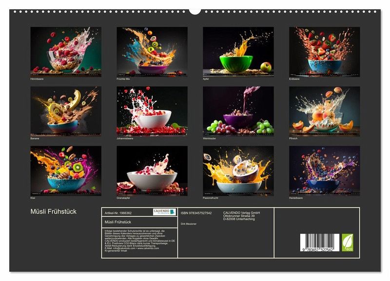 Dieser Kalender ist nichts für schwache Nerven oder knurrende Mägen. Denn vom bloßen Hinschauen bekommt man sofort Appetit und Hunger auf diese wunderbar inszenierten Müslikreationen. Dieser einmalige Kalender eignet sich auch hervorragend als Geschenk für Ihre Bekannten und Verwandten, sie werden sich ganz bestimmt darüber freuen. Erstellt wurden die Bilder im Übrigen mit einer KI und Photoshop.