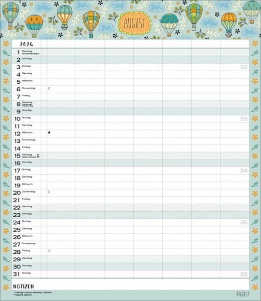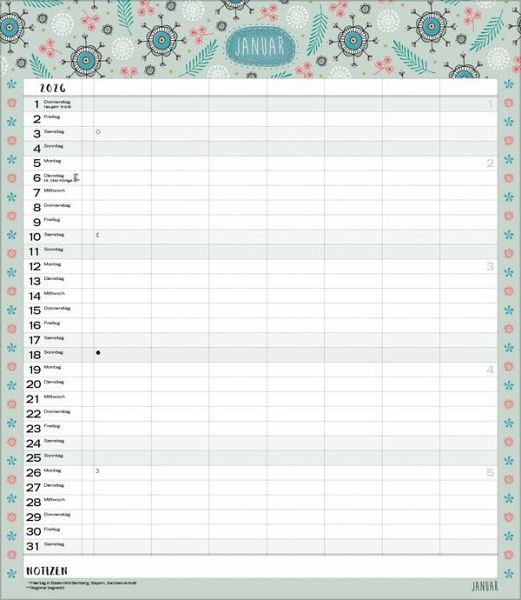 Weitere Informationen wie Mondphasen, Ferientermine und Feiertage (auch regionale) sowie deutlich lesbare Kalenderwochen runden den Kalender ab und sorgen für einen vollständigen Überblick Ihres Jahres.