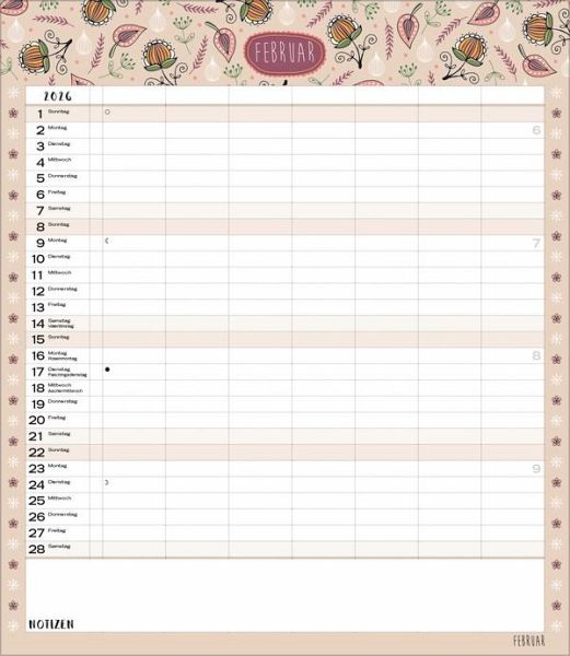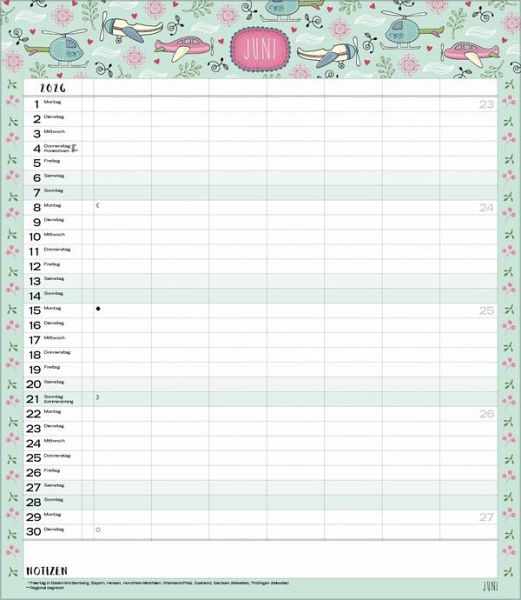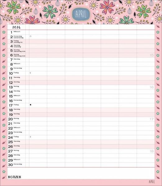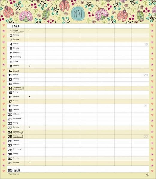 Bringen Sie gute Laune in Ihren Alltag! Liebevolle und fröhliche Muster in zarten Farben und mit Fineliner-Elementen sind ein echter Hingucker an der Wand. Profitieren Sie von der hohen Funktionalität eines modernen Terminplaners: Mit sieben Spalten zum Eintragen von Geburtstagen, Terminen und Erinnerungen bietet der Multiplaner viel Platz für Notizen. Damit ist es auch möglich mehrere Termine in einen Tag zu schreiben. Der Organisation des Alltags von großen und kleinen Familien steht somit nix mehr im Weg. Neben dem gesamten Kalenderjahr enthält der Wandplaner auch eine Vorschau bis März des Folgejahres. Exklusiv entworfen und gestaltet von Mo Büdinger.