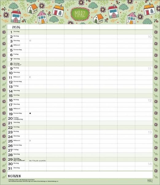 Übersichtlicher Familienplaner mit 7 großen Spalten; sehr stabile Rückwand; 40 x 46 cm Praktische Zusatzspalte für Ferien, Müll und weitere Aktivitäten Terminkalender mit viel Platz für Eintragungen, ohne störende Bilder in den Spalten leichte Beschreibbarkeit, auch mit Bunt- und Bleistiften; Datumsschieber
