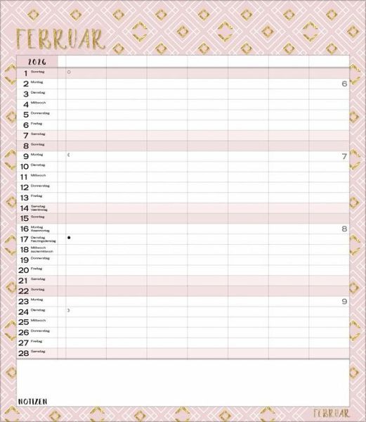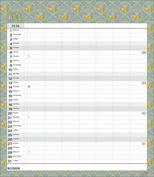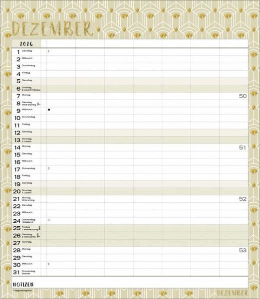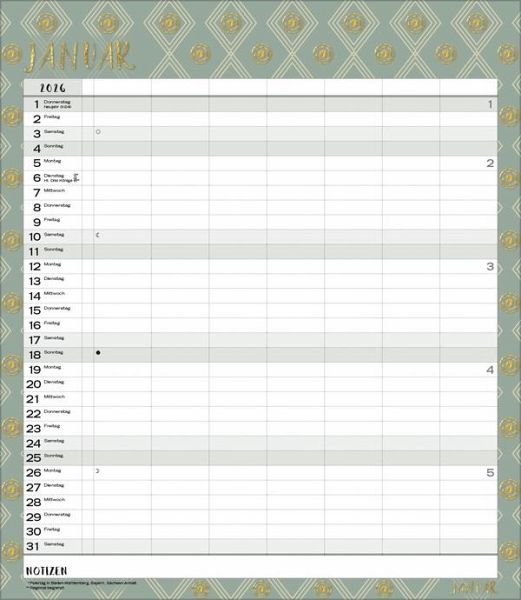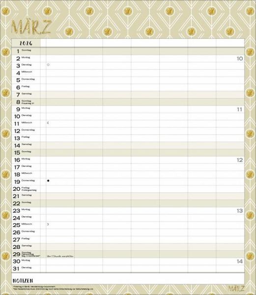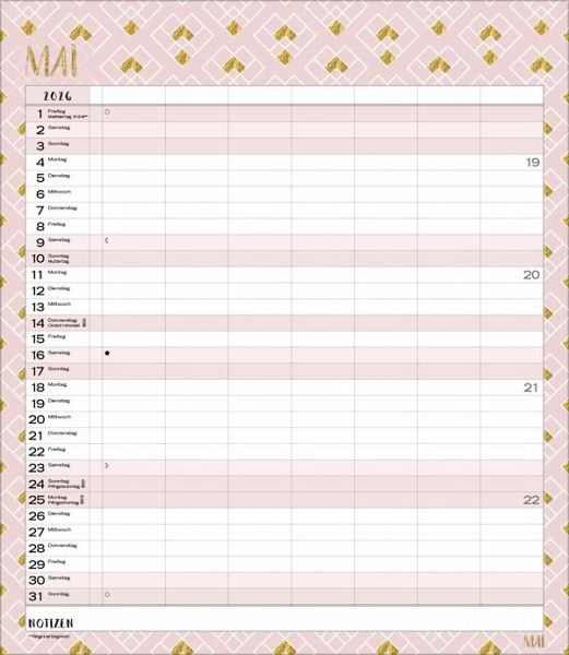 Bringen Sie etwas Glamour in Ihren Alltag! Zarte Pastelltöne und edles Schwarz treffen auf geometrische Trendmuster, Typoart und Grafiken im Goldglitter-Look. Setzen Sie Ihre Termine glamourös in Szene und profitieren Sie zugleich von der hohen Funktionalität eines modernen Terminplaners: Mit sieben Spalten zum Eintragen von Geburtstagen, Terminen und Erinnerungen bietet der Multiplaner viel Platz für Notizen. Damit ist es auch möglich mehrere Termine in einen Tag zu schreiben. Der Organisation des Alltags von großen und kleinen Familien steht somit nix mehr im Weg. Neben dem gesamten Kalenderjahr enthält der Wandplaner auch eine Vorschau bis März des Folgejahres.