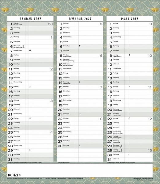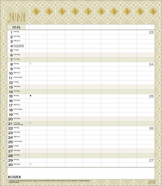 Weitere Informationen wie Mondphasen, Ferientermine und Feiertage (auch regionale) sowie deutlich lesbare Kalenderwochen runden den Kalender ab und sorgen für einen vollständigen Überblick Ihres Jahres.