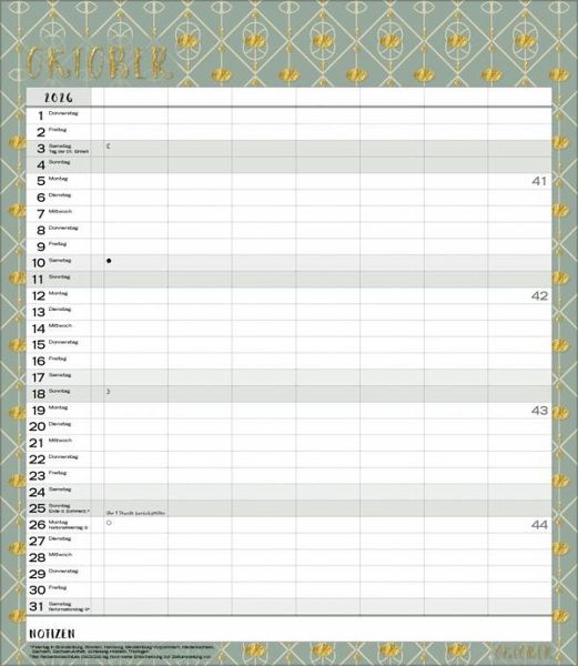 Übersichtlicher Familienplaner mit 7 großen Spalten; sehr stabile Rückwand; 40 x 46 cm Praktische Zusatzspalte für Ferien, Müll und weitere AktivitätenTerminkalender mit viel Platz für Eintragungen, ohne störende Bilder in den Spalten leichte Beschreibbarkeit, auch mit Bunt- und Bleistiften; Datumsschieber in Herzform Deutsches Kalendarium mit regionalen Feiertagen für Deutschland, Österreich und Schweiz Farblich hervorgehobene Sonn- und Feiertage, sowie Anzeige der Zeitumstellung Gedruckt auf dickem und umweltfreundlichem FSC Papier