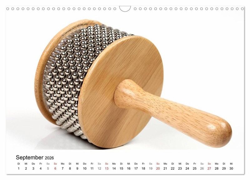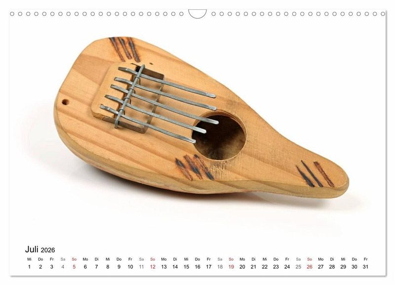 Dieser Kalender besteht aus verschiedenen Musikinstrumenten, angefangen von klassischen Instrumenten wie Geige und Violoncello bis zu exotischen Klangerzeugern wie Kalimba, Cabasa und Zymbeln.