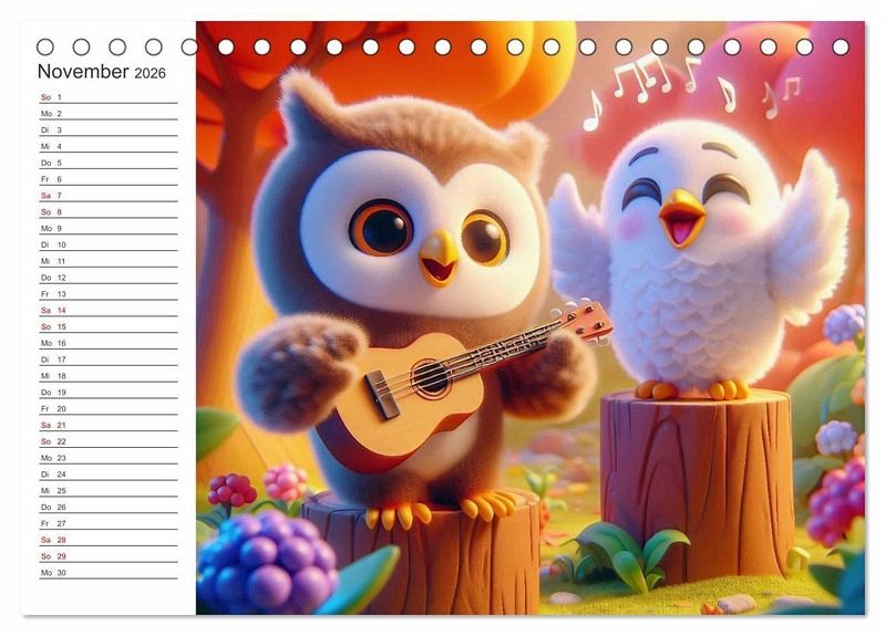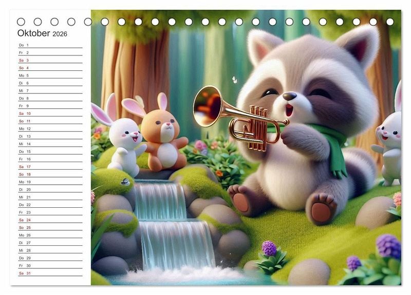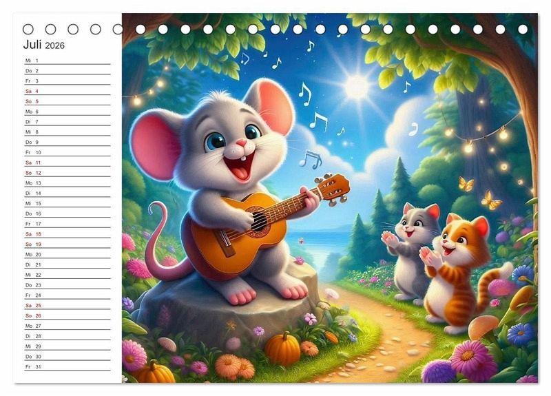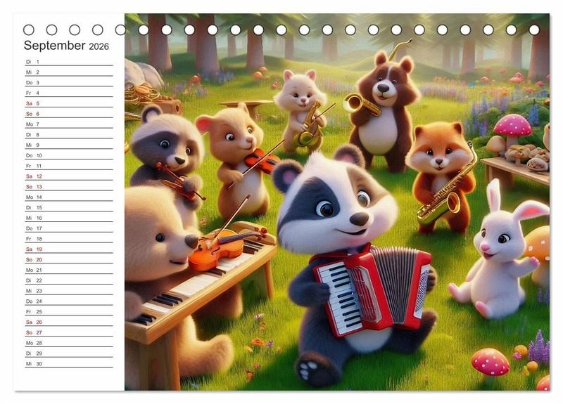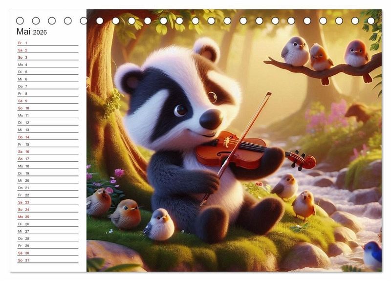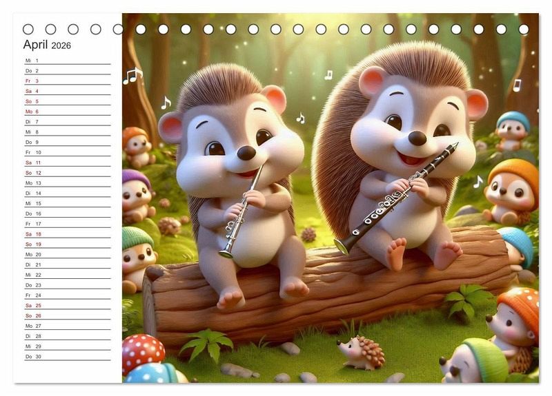 Tauche ein in eine Welt voller Magie und Musik, wo die Tiere des Waldes ihre Instrumente stimmen und gemeinsam zauberhafte Melodien erschaffen. Jeder Monat bringt dir ein neues, liebevoll illustriertes Bild von talentierten Waldbewohnern, die ihre musikalischen Künste präsentieren.
