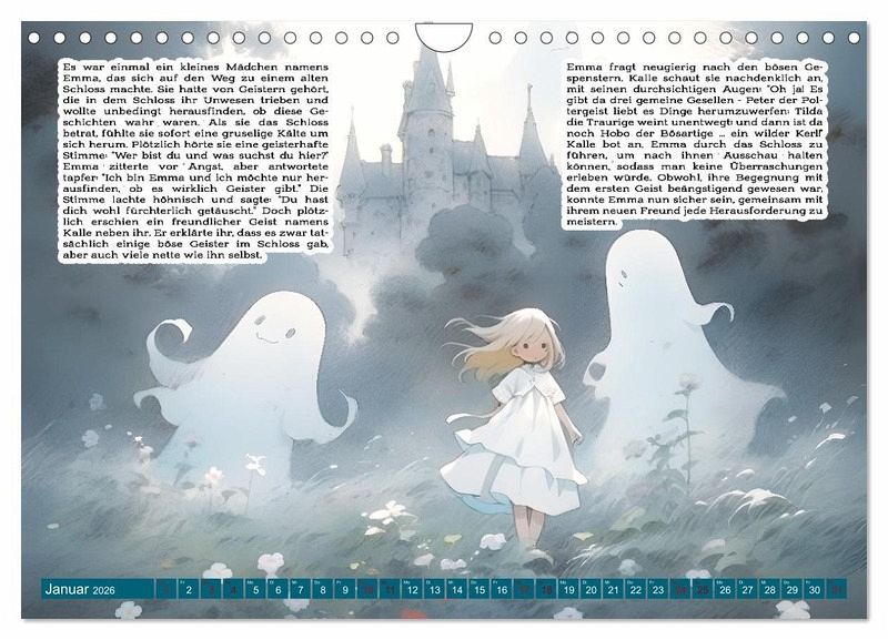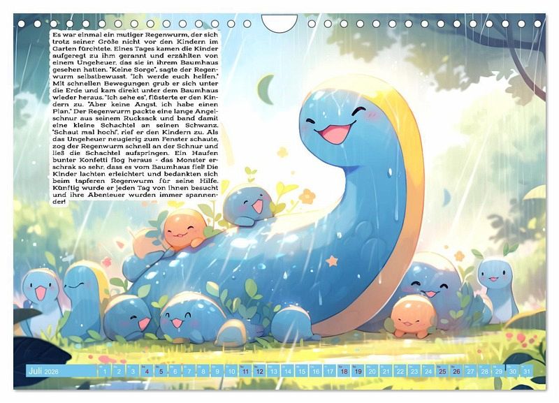 Abbildungen: Januar: Emma Februar: Die Pilzfamilie März: Die Waldkinder April: Die Froschfamilie Mai: Der rote Drache Juni: Der Wassergeist Juli: Der