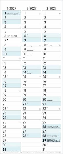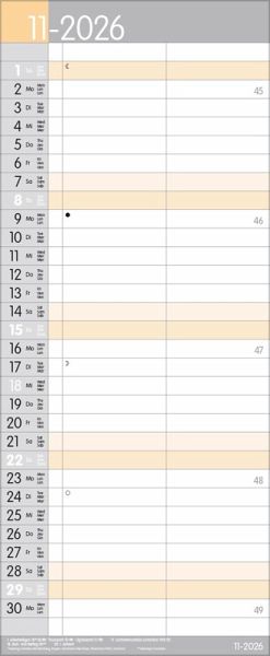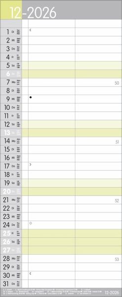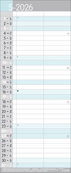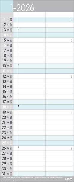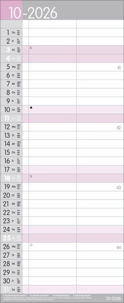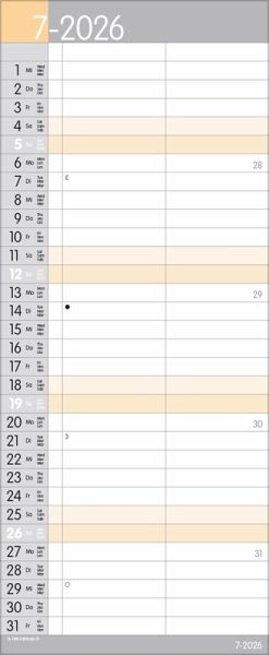 Übersichtlicher Familienplaner für bis zu 2 Personen; sehr stabile Rückwand; 19 x 46 cm Terminkalender mit viel Platz für Eintragungen, ohne störende Bilder in den Spalten leichte Beschreibbarkeit, auch mit Bunt- und Bleistiften Mehrsprachiges Kalendarium (d,e,f,i) mit regionalen Feiertagen für Deutschland, Österreich und Schweiz Farblich hervorgehobene Sonn- und Feiertage, sowie Anzeige der Zeitumstellung Gedruckt auf dickem und umweltfreundlichem FSC Papier