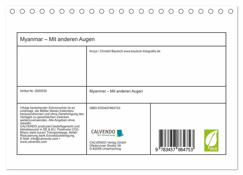 QUALITÄT - Hochwertiger Fotokalender mit 12 wunderschönen Motiven auf lichtbeständigem Bilderdruckpapier, robuste Spiralbindung.NACHHALTIG - deutliche Abfallreduzierung durch bedarfsgerechte Einzelstückfertigung, umweltfreundliches FSC-zertifiziertes Papier, Produktion in Deutschland, klimabewusste Logistik.PERFEKTES GESCHENK - Kalender für Freunde und Familie, für Kinder und Erwachsene, jung und alt, zu Weihnachten, Geburtstag oder zwischendurch.VIELFALT - Bildkalender in verschiedenen Formaten, z.B. DIN A5, DIN A4, DIN A3 sowie DIN A2. Ob Naturmotiv, Gemälde oder Fotos, ideal für ein persönliches Wohlfühlambiente.Myanmar in Schwarz-Weiß-Bildern mit Farbe von Autor(in): Christof Bautsch
