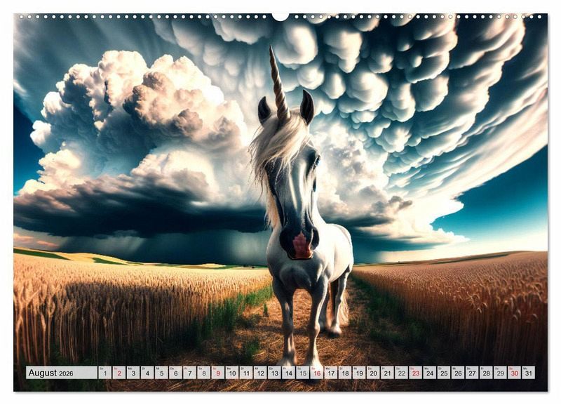 August: Einhorn in einem Sommergewitter: Ein Einhorn steht kraftvoll in einem Feld mit aufziehenden Gewitterwolken.