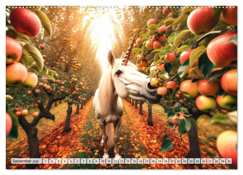 September: Einhorn in einem Apfelhain: Ein neugieriges Einhorn in einem Obstgarten mit reifen Äpfeln.