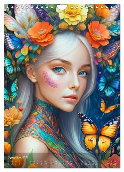 September: Blauäugige blonde Fantasiefrau mit buntem Blumenschmuck und Schmetterlingen