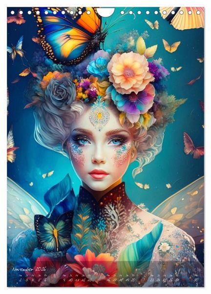 November: Weißblonde blauäugige Fantasiefrau mit buntem Blumenschmuck und Schmetterlingen