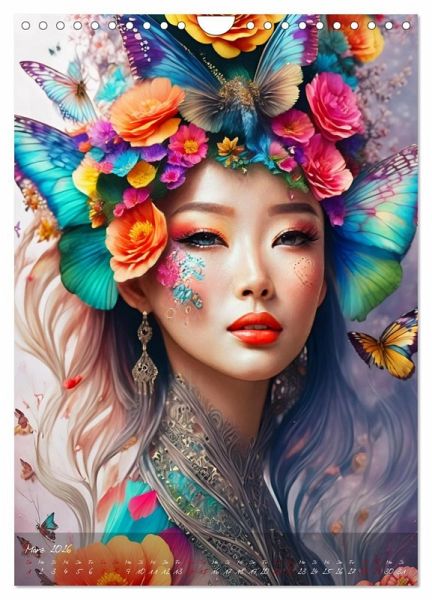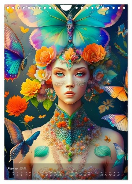 Februar: Grünäugige Fantasiefrau trägt bunte Blumenschmuck und großen Schmetterling