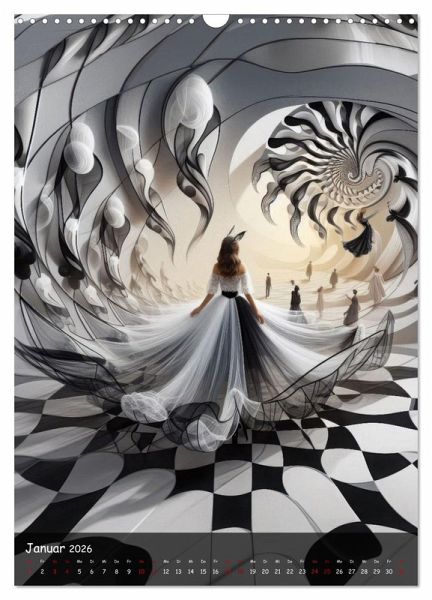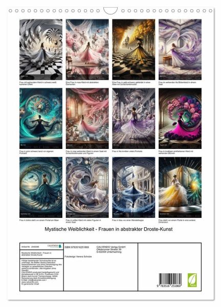 Tauche ein in eine Welt voller Geheimnisse und Schönheit. Dieser mit KI erstellte Kalender vereint die Eleganz der Weiblichkeit mit der faszinierenden Kunst des Droste-Effekts. Bei dem Effekt ist innerhalb eines größeren Motivs eine kleinere Version desselben Motivs enthalten. Jeder Monat enthüllt ein neues, atemberaubendes Bild, das die Sinne verzaubert und die Fantasie beflügelt. Jedes Bild ist ein Kunstwerk für sich, das die mystische Anziehungskraft der Frauen in abstrakter Form einfängt.
