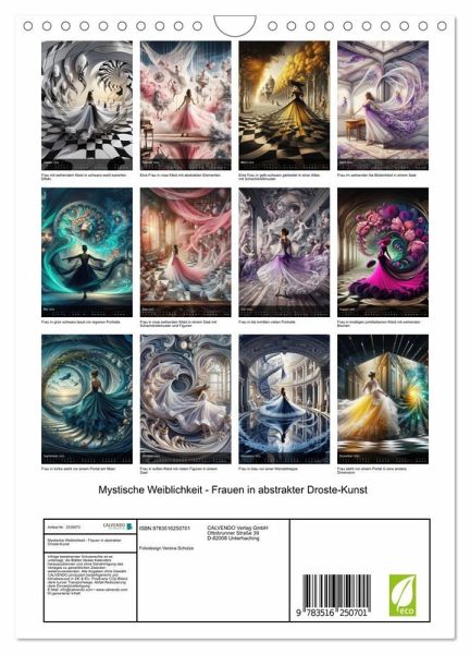 Tauche ein in eine Welt voller Geheimnisse und Schönheit. Dieser mit KI erstellte Kalender vereint die Eleganz der Weiblichkeit mit der faszinierenden Kunst des Droste-Effekts. Bei dem Effekt ist innerhalb eines größeren Motivs eine kleinere Version desselben Motivs enthalten. Jeder Monat enthüllt ein neues, atemberaubendes Bild, das die Sinne verzaubert und die Fantasie beflügelt. Jedes Bild ist ein Kunstwerk für sich, das die mystische Anziehungskraft der Frauen in abstrakter Form einfängt.