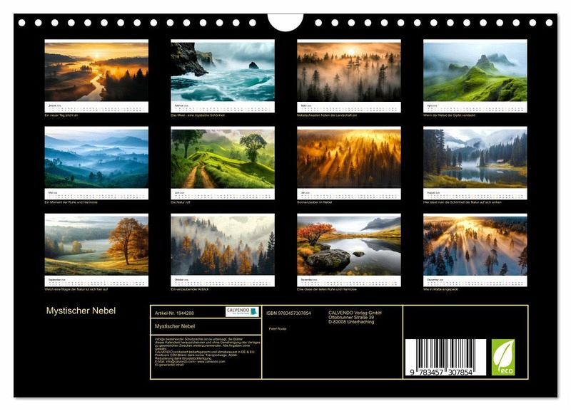 Tauchen Sie ein in eine Welt, in der die Natur flüstert und Nebelschwaden wie Schleier über stillen Wäldern, ruhigen Seen und sanft fließenden Flüssen liegen. Dieser KI-Kalender bringt die Magie dieser verzauberten Landschaften zu Ihnen nach Hause - Orte, an denen die Zeit stillsteht und die Welt in zarte Stille gehüllt ist. Entdecken Sie die Schönheit der Natur in ihrem mystischen Gewand, wenn Sonnenstrahlen sich ihren Weg durch dichte Nebelfelder brechen, Wasserflächen wie in Watte gepackt daliegen und die Welt in eine beruhigende Melancholie tauchen. Lieben Sie Momente der tiefen Ruhe und Harmonie in der Natur, dann ist dieser Kalender perfekt für Sie und alle, die sich nach einem stillen Rückzugsort für ihre Gedanken sehnen.