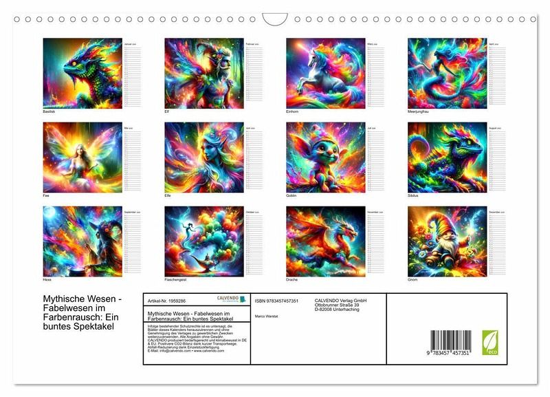 QUALITÄT - Hochwertiger Fotokalender mit 12 wunderschönen Motiven auf lichtbeständigem Bilderdruckpapier, robuste Spiralbindung mit Aufhängebügel.NACHHALTIG - deutliche Abfallreduzierung durch bedarfsgerechte Einzelstückfertigung, umweltfreundliches FSC-zertifiziertes Papier, Produktion in Deutschland, klimabewusste Logistik.PERFEKTES GESCHENK - Kalender für Freunde und Familie, für Kinder und Erwachsene, jung und alt, zu Weihnachten, Geburtstag oder zwischendurch.VIELFALT - Bildkalender in verschiedenen Formaten, z.B. DIN A5, DIN A4, DIN A3 sowie DIN A2. Ob Naturmotiv, Gemälde oder Fotos, ideal für ein persönliches Wohlfühlambiente.Farbenpracht mythischer Kreaturen von Autor(in): Marco Warstat