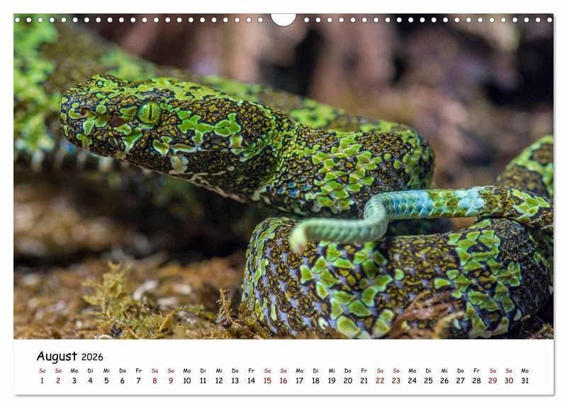 Schlangen: Fremdartig und angsteinflößend. Faszinierend und ehrfurchtgebietend. Im manchen Kulturen verkörpern sie das Böse. Andere verehren sie als Götter. Die Bilder in diesem Kalender zeigen die geheimnisvolle Schönheit der Schlangen.