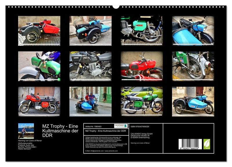 PREMIUM-LINIE - Brillanter Fotokalender mit 12 wunderschönen Motiven, Kunstdruck in Hochglanz in Museumsqualität.QUALITÄT - edle Materialien, stabile Rückwand mit 2 innovativen Einstecktaschen für eine optimale Präsentation an der Wand.NACHHALTIG - deutliche Abfallreduzierung durch bedarfsgerechte Einzelstückfertigung, umweltfreundliches FSC-zertifiziertes Papier, Produktion in Deutschland, klimabewusste Logistik.PERFEKTES GESCHENK - Kalender für Freunde und Familie, für Kinder und Erwachsene, jung und alt, zu Weihnachten, Geburtstag oder zwischendurch.Verschiedene Modelle der MZ Trophy in Kuba von Autor(in): Henning von Loewis of Menar