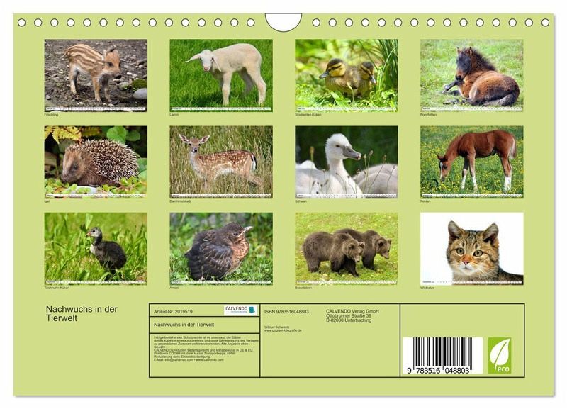 Nachwuchs in der Tierwelt - entzückende Bilder von Entenküken, jungen Braunbären, Fohlen, kleinen Vögeln und einem niedlichen Igel. Motive mit Tierkindern die den Kindern, aber auch den Erwachsenen ein Lächeln ins Gesicht zaubern. Machen Sie sich und ihren Kindern mit diesem Kalender eine Freude fürs ganze Jahr!