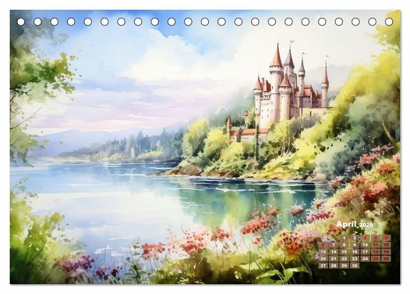 Lassen Sie sich jeden Monat von einem zauberhaften, nostalgischen Schloss in wunderschöner und detailreicher Aquarellmalerei verzaubern und tauchen Sie ein in die Geschichte und Romantik dieser Orte. Ob in den Bergen, an einer Flussaue oder in einer Märchenlandschaft, jedes Schloss hat Dank einer KI seinen eigenen Charme und Charakter.