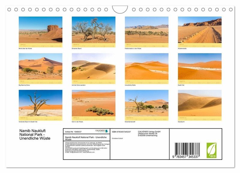 QUALITÄT - Hochwertiger Fotokalender mit 12 wunderschönen Motiven auf lichtbeständigem Bilderdruckpapier, robuste Spiralbindung mit Aufhängebügel.NACHHALTIG - deutliche Abfallreduzierung durch bedarfsgerechte Einzelstückfertigung, umweltfreundliches FSC-zertifiziertes Papier, Produktion in Deutschland, klimabewusste Logistik.PERFEKTES GESCHENK - Kalender für Freunde und Familie, für Kinder und Erwachsene, jung und alt, zu Weihnachten, Geburtstag oder zwischendurch.VIELFALT - Bildkalender in verschiedenen Formaten, z.B. DIN A5, DIN A4, DIN A3 sowie DIN A2. Ob Naturmotiv, Gemälde oder Fotos, ideal für ein persönliches Wohlfühlambiente.Faszinierende Wüstenwelt Namibias von Autor(in): Christiane Kulisch
