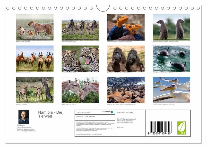 QUALITÄT - Hochwertiger Fotokalender mit 12 wunderschönen Motiven auf lichtbeständigem Bilderdruckpapier, robuste Spiralbindung mit Aufhängebügel.NACHHALTIG - deutliche Abfallreduzierung durch bedarfsgerechte Einzelstückfertigung, umweltfreundliches FSC-zertifiziertes Papier, Produktion in Deutschland, klimabewusste Logistik.PERFEKTES GESCHENK - Kalender für Freunde und Familie, für Kinder und Erwachsene, jung und alt, zu Weihnachten, Geburtstag oder zwischendurch.VIELFALT - Bildkalender in verschiedenen Formaten, z.B. DIN A5, DIN A4, DIN A3 sowie DIN A2. Ob Naturmotiv, Gemälde oder Fotos, ideal für ein persönliches Wohlfühlambiente.12 wunderschöne Tieraufnahmen aus Namibia von dem Fotografen und Grafik-Designer Olaf Bruhn von Autor(in): Olaf Bruhn