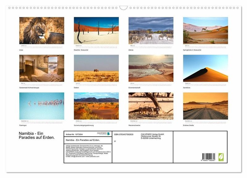 Namibia ist ein wahres Paradies auf Erden. In Namibia gibt es eine atemberaubende Tierwelt und eine unfassbar vielfältige Landschaft. Mit diesem Kalender können Sie in das wunderschöne Land eintauchen und das Namibia-Feeling in ihre 4 Wände holen.