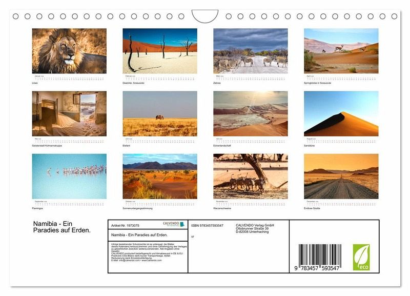 Namibia ist ein wahres Paradies auf Erden. In Namibia gibt es eine atemberaubende Tierwelt und eine unfassbar vielfältige Landschaft. Mit diesem Kalender können Sie in das wunderschöne Land eintauchen und das Namibia-Feeling in ihre 4 Wände holen.