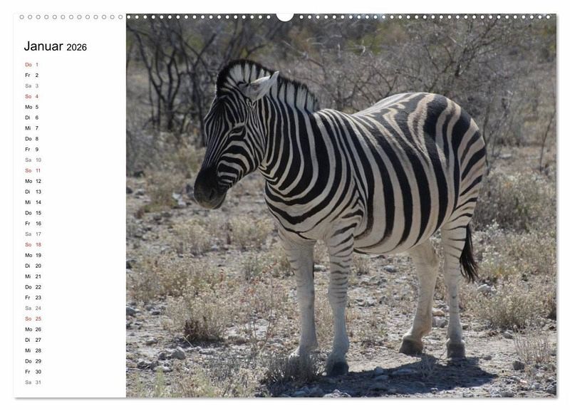 Gezeigt werden auf 12 Bilder verteilt einen Reise durch die vielfältige Tierwelt Namibias. Die "Big Five" sind mit Leopard und Elefant vertreten, die "Little Five" mit der "Dancing White Lady" und dem Namib-Gecko. Dazu weitere Tiere wie Springböcke, Giraffen und Zebras. Ausgeführt als praktischer Terminplaner.