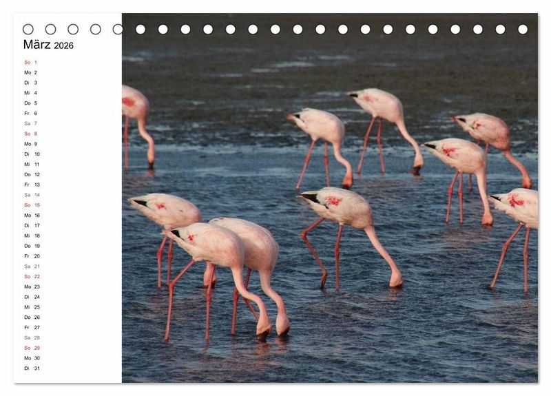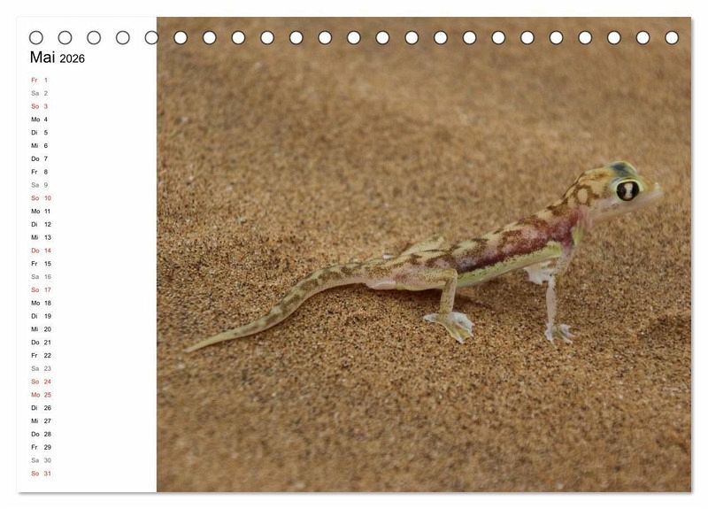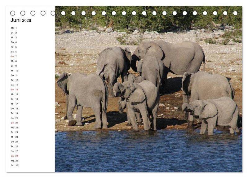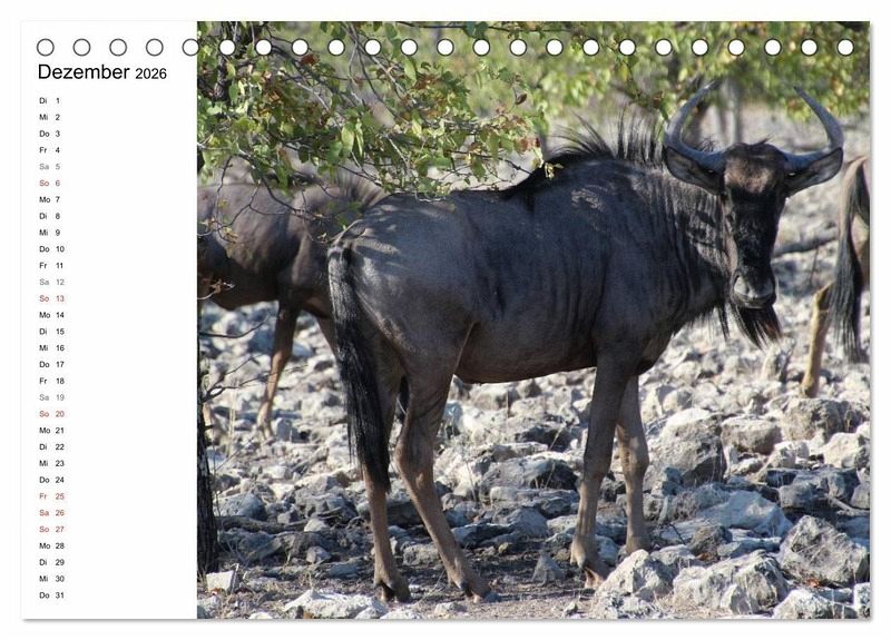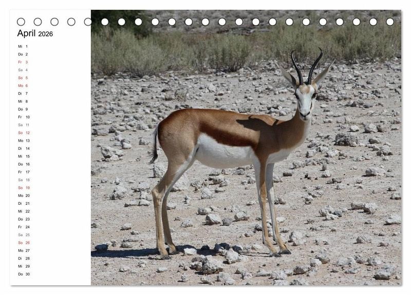 Gezeigt werden auf 12 Bilder verteilt einen Reise durch die vielfältige Tierwelt Namibias. Die "Big Five" sind mit Leopard und Elefant vertreten, die "Little Five" mit der "Dancing White Lady" und dem Namib-Gecko. Dazu weitere Tiere wie Springböcke, Giraffen und Zebras. Ausgeführt als praktischer Terminplaner.
