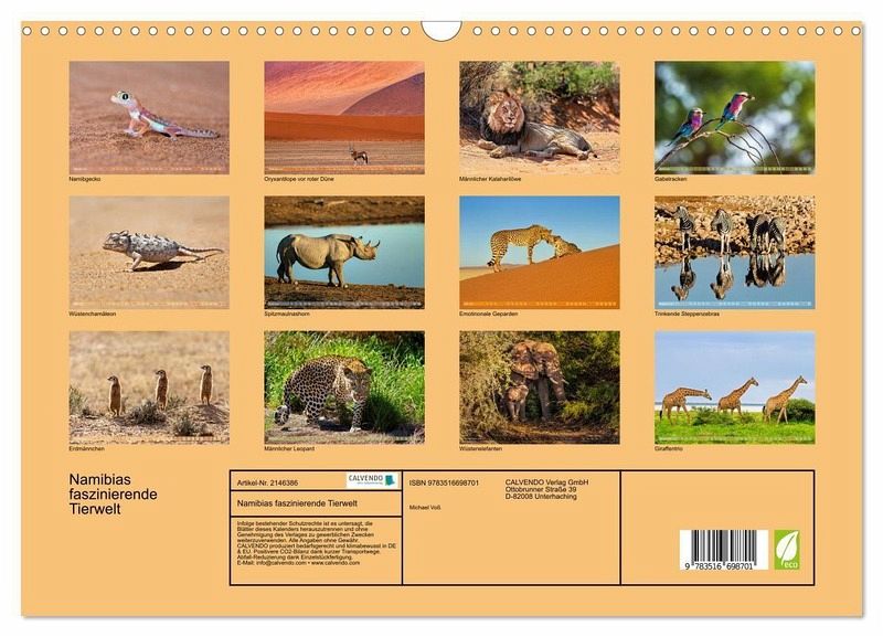 QUALITÄT - Hochwertiger Fotokalender mit 12 wunderschönen Motiven auf lichtbeständigem Bilderdruckpapier, robuste Spiralbindung mit Aufhängebügel.NACHHALTIG - deutliche Abfallreduzierung durch bedarfsgerechte Einzelstückfertigung, umweltfreundliches FSC-zertifiziertes Papier, Produktion in Deutschland, klimabewusste Logistik.PERFEKTES GESCHENK - Kalender für Freunde und Familie, für Kinder und Erwachsene, jung und alt, zu Weihnachten, Geburtstag oder zwischendurch.VIELFALT - Bildkalender in verschiedenen Formaten, z.B. DIN A5, DIN A4, DIN A3 sowie DIN A2. Ob Naturmotiv, Gemälde oder Fotos, ideal für ein persönliches Wohlfühlambiente.Lassen Sie sich von der einzigartigen Tierwelt Namibias faszinieren. von Autor(in): Michael Voß