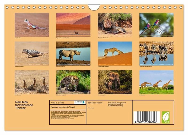 QUALITÄT - Hochwertiger Fotokalender mit 12 wunderschönen Motiven auf lichtbeständigem Bilderdruckpapier, robuste Spiralbindung mit Aufhängebügel.NACHHALTIG - deutliche Abfallreduzierung durch bedarfsgerechte Einzelstückfertigung, umweltfreundliches FSC-zertifiziertes Papier, Produktion in Deutschland, klimabewusste Logistik.PERFEKTES GESCHENK - Kalender für Freunde und Familie, für Kinder und Erwachsene, jung und alt, zu Weihnachten, Geburtstag oder zwischendurch.VIELFALT - Bildkalender in verschiedenen Formaten, z.B. DIN A5, DIN A4, DIN A3 sowie DIN A2. Ob Naturmotiv, Gemälde oder Fotos, ideal für ein persönliches Wohlfühlambiente.Lassen Sie sich von der einzigartigen Tierwelt Namibias faszinieren. von Autor(in): Michael Voß