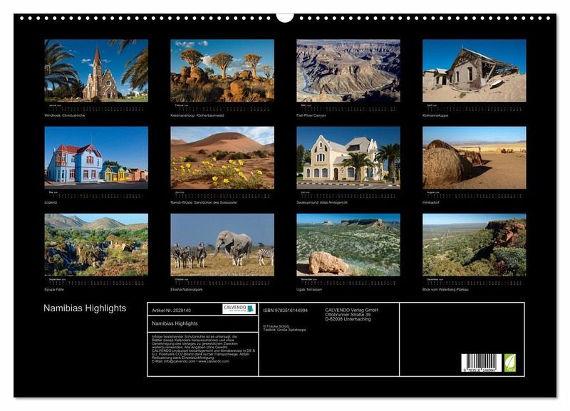 Erleben Sie Namibia mit den schönen und abwechslungsreichen Sehenswürdigkeiten und reisen Sie mit diesem Kalender durch das Jahr. Ihnen werden unter anderem die berühmten Köcherbäume begegnen, der Fish River Canyon, die Geisterstadt Kolmannskuppe, die großen Dünen des Sossusvlei, die Epupa-Fälle und vieles mehr.