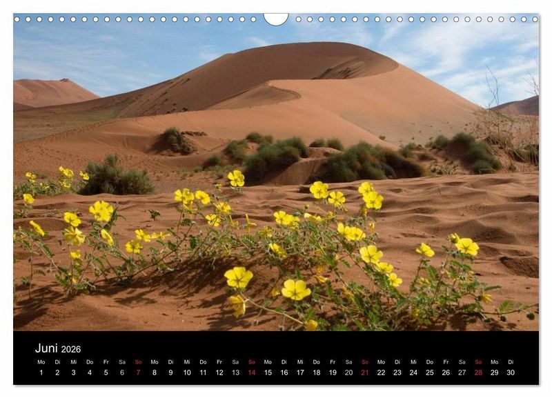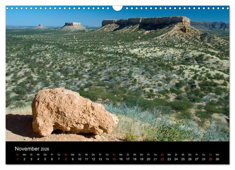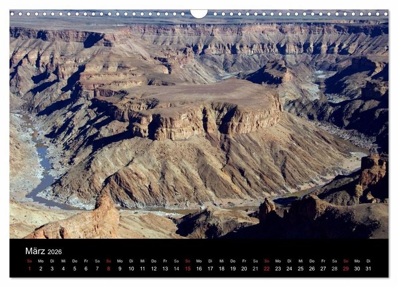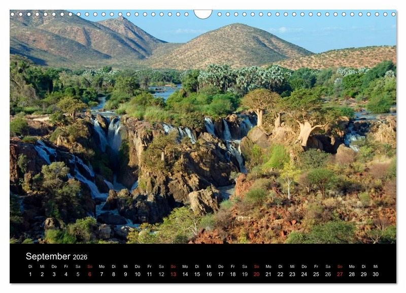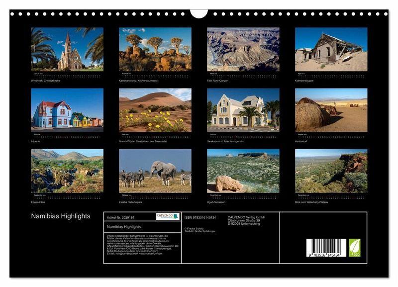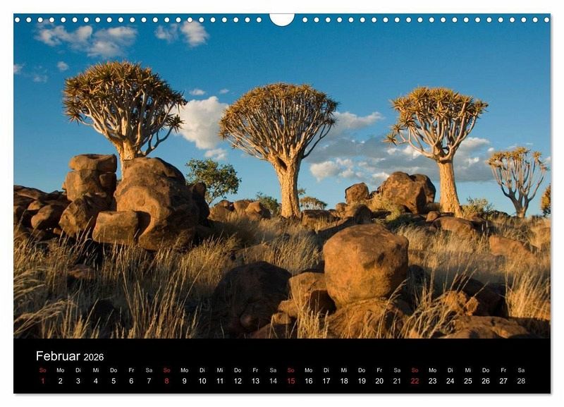Erleben Sie Namibia mit den schönen und abwechslungsreichen Sehenswürdigkeiten und reisen Sie mit diesem Kalender durch das Jahr. Ihnen werden unter anderem die berühmten Köcherbäume begegnen, der Fish River Canyon, die Geisterstadt Kolmannskuppe, die großen Dünen des Sossusvlei, die Epupa-Fälle und vieles mehr.