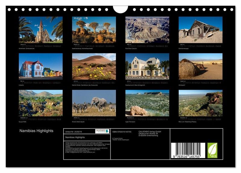 Erleben Sie Namibia mit den schönen und abwechslungsreichen Sehenswürdigkeiten und reisen Sie mit diesem Kalender durch das Jahr. Ihnen werden unter anderem die berühmten Köcherbäume begegnen, der Fish River Canyon, die Geisterstadt Kolmannskuppe, die großen Dünen des Sossusvlei, die Epupa-Fälle und vieles mehr.