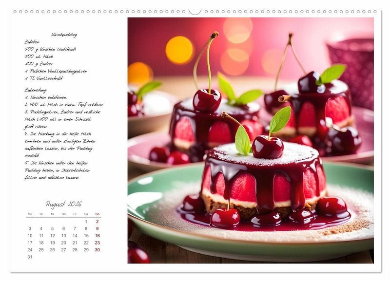 Entdecken Sie jeden Monat aufs Neue eine süße Verführung! Der Kalender präsentiert Ihnen atemberaubende, KI-generierte Bilder von unwiderstehlichen Desserts wie Mousse au chocolat und Panna Cotta, das Ihnen das Wasser im Mund zusammenlaufen lässt. Alle Desserts sind mit schnellen und einfachen Rezepten versehen, die es Ihnen ermöglichen, diese Köstlichkeiten auch in Ihrer eigenen Küche zu zaubern.