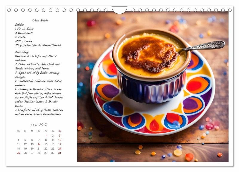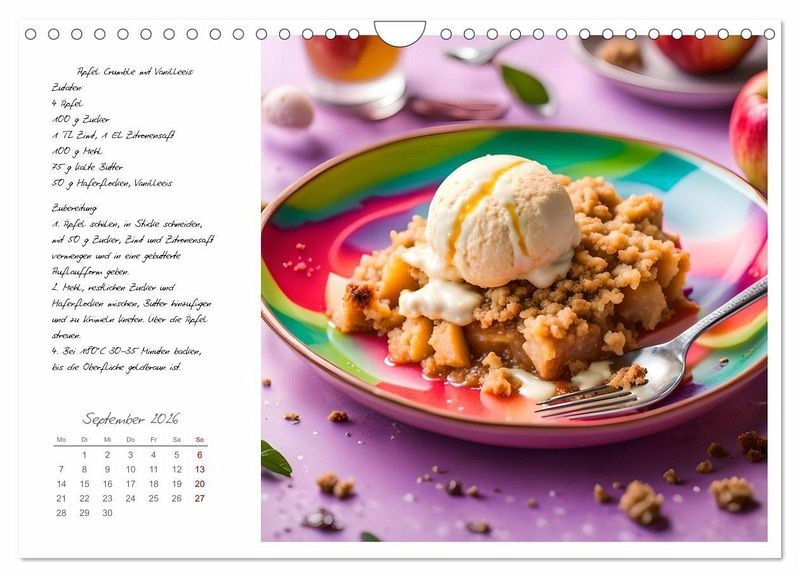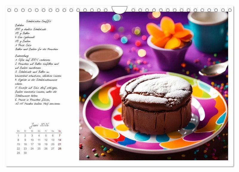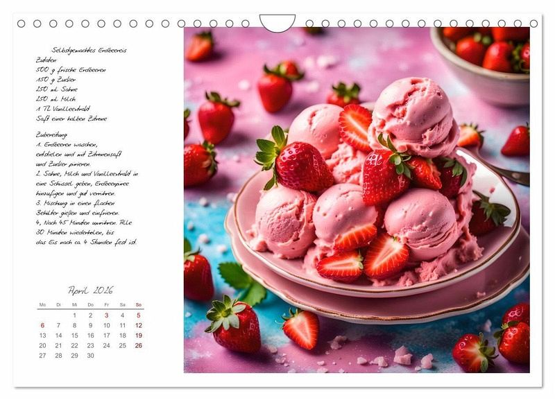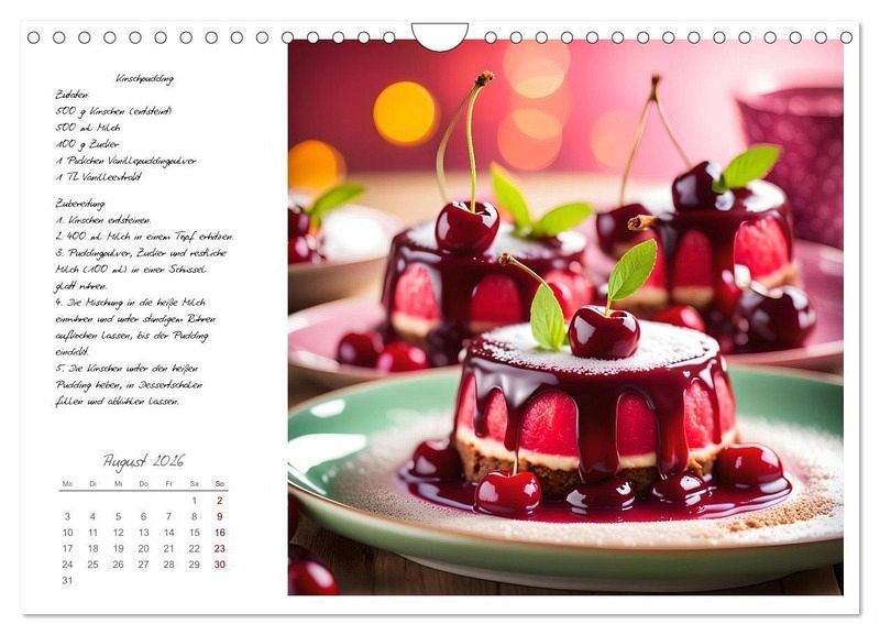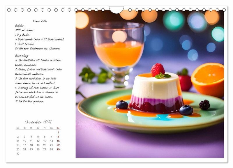 Entdecken Sie jeden Monat aufs Neue eine süße Verführung! Der Kalender präsentiert Ihnen atemberaubende, KI-generierte Bilder von unwiderstehlichen Desserts wie Mousse au chocolat und Panna Cotta, das Ihnen das Wasser im Mund zusammenlaufen lässt. Alle Desserts sind mit schnellen und einfachen Rezepten versehen, die es Ihnen ermöglichen, diese Köstlichkeiten auch in Ihrer eigenen Küche zu zaubern.