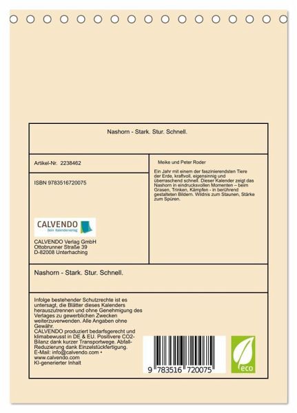 Majestätisch, wild und voller Charakter, dieser Kalender zeigt das Nashorn in all seinen Facetten - vom sanften Muttertier bis zum kämpferischen Einzelgänger. Beeindruckende Szenen aus der Savanne wechseln sich ab mit intimen Nahaufnahmen, ein wachsames Auge, ein imposantes Horn, ein lauschendes Ohr. Jede Szene erzählt von Kraft, Eigenwilligkeit und überraschender Geschwindigkeit. Gestaltet mit dem Auge fürs Detail werden diese Bilder zu einem visuellen Porträt eines Tieres, wobei die grafische Umsetzung im Zusammenspiel klassischer Gestaltung und ausgewählter KI-basierter Methoden erfolgte. Ein perfektes Geschenk für alle Tier- und Naturfans.