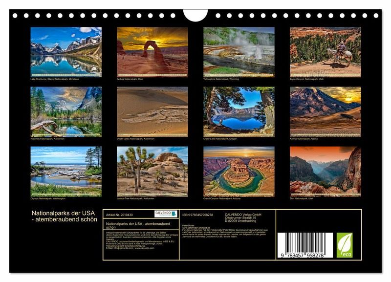 QUALITÄT - Hochwertiger Fotokalender mit 12 wunderschönen Motiven auf lichtbeständigem Bilderdruckpapier, robuste Spiralbindung mit Aufhängebügel.NACHHALTIG - deutliche Abfallreduzierung durch bedarfsgerechte Einzelstückfertigung, umweltfreundliches FSC-zertifiziertes Papier, Produktion in Deutschland, klimabewusste Logistik.PERFEKTES GESCHENK - Kalender für Freunde und Familie, für Kinder und Erwachsene, jung und alt, zu Weihnachten, Geburtstag oder zwischendurch.VIELFALT - Bildkalender in verschiedenen Formaten, z.B. DIN A5, DIN A4, DIN A3 sowie DIN A2. Ob Naturmotiv, Gemälde oder Fotos, ideal für ein persönliches Wohlfühlambiente.Mit 59 offiziellen Nationalparks gelten die USA als eines der Länder mit den meisten Naturschutzgebieten. von Autor(in): Peter Roder