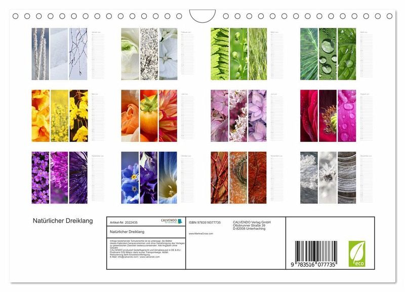 Die Natur ist der beste Künstler! Erleben Sie 12 hinreißende, natürliche Farben Dreiklänge der Natur, präsentiert in farblich koordinierten Triptychen die Sie das ganze Jahr über in Ihrem Heim begleiten werden. Die Fotografin wurde mit dem Jurypreis in der Kategorie "Fotografin des Jahres" ausgezeichnet.