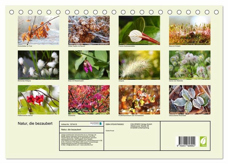 Das ganze Jahr über findet die Fotografin zauberhafte Motive in der Natur. Vom Raureif überzuckerte Blätter und Pflanzen, frisches Grün im Frühling, Pflanzensamen und -früchte im späten Sommer und Herbst - all das entfaltet seinen Charme in diesem wunderschönen Kalender. Ein tolles Geschenk für Naturliebhaber.